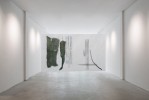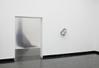 Thematically focused on drawing, Aski Dahl's work engages in reflective investigations of the medium. In (Title), the drawing is transmitted from the surface of the paper, extended into the room. Black shapes and lines composes the drawing within the space, veiled behind a large semitransparent sheet. The sheet effects the visibility of the objects behind it, revealing detail or smudging and fading with distance. Its flat, symmetrical surface operates as the pictorial plane of the image, displaying a tangible impression of facing a large, classical drawing. The monochromatic hues of the black shapes appear like the recognizable marks of ink or a pencil on paper, though when simultaneously demonstrating depth and sculpturality, a visual double-exposure occurs, raising a tension between two- and three-dimensionality. The experience of the metaphorical nature of the work relies on the movement and gaze of the viewer. As the viewer engages with the work, it consequently formulates new propositions on what drawing and image is or can be.